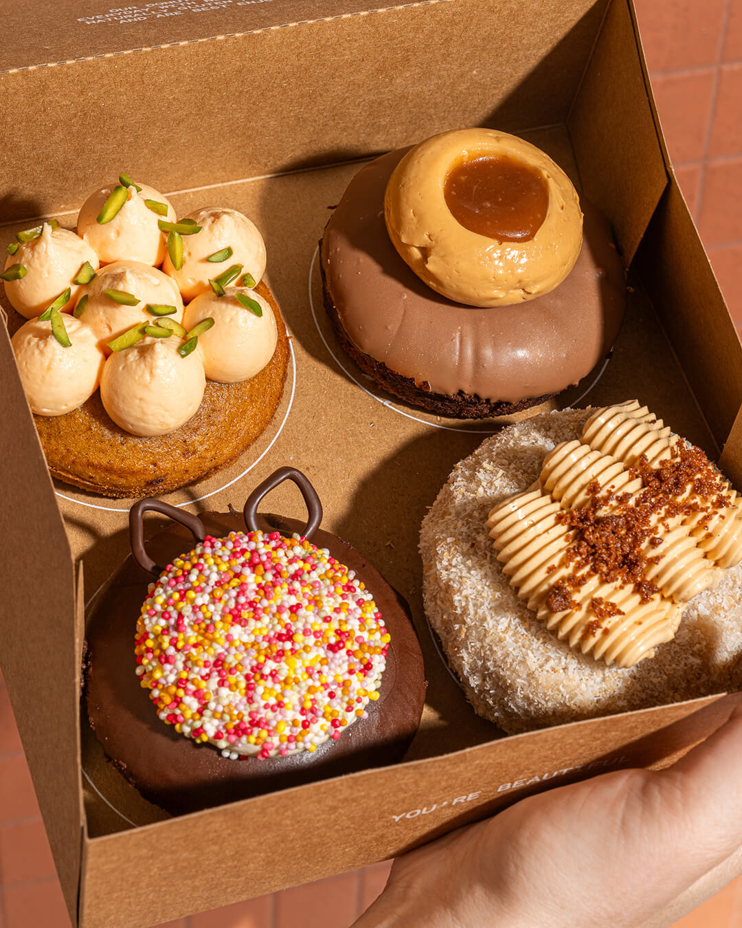 Caramel Egg Donut (GF) – A chocolate base dipped in milk couverture chocolate, filled with dulce de leche buttercream and house-made caramel.